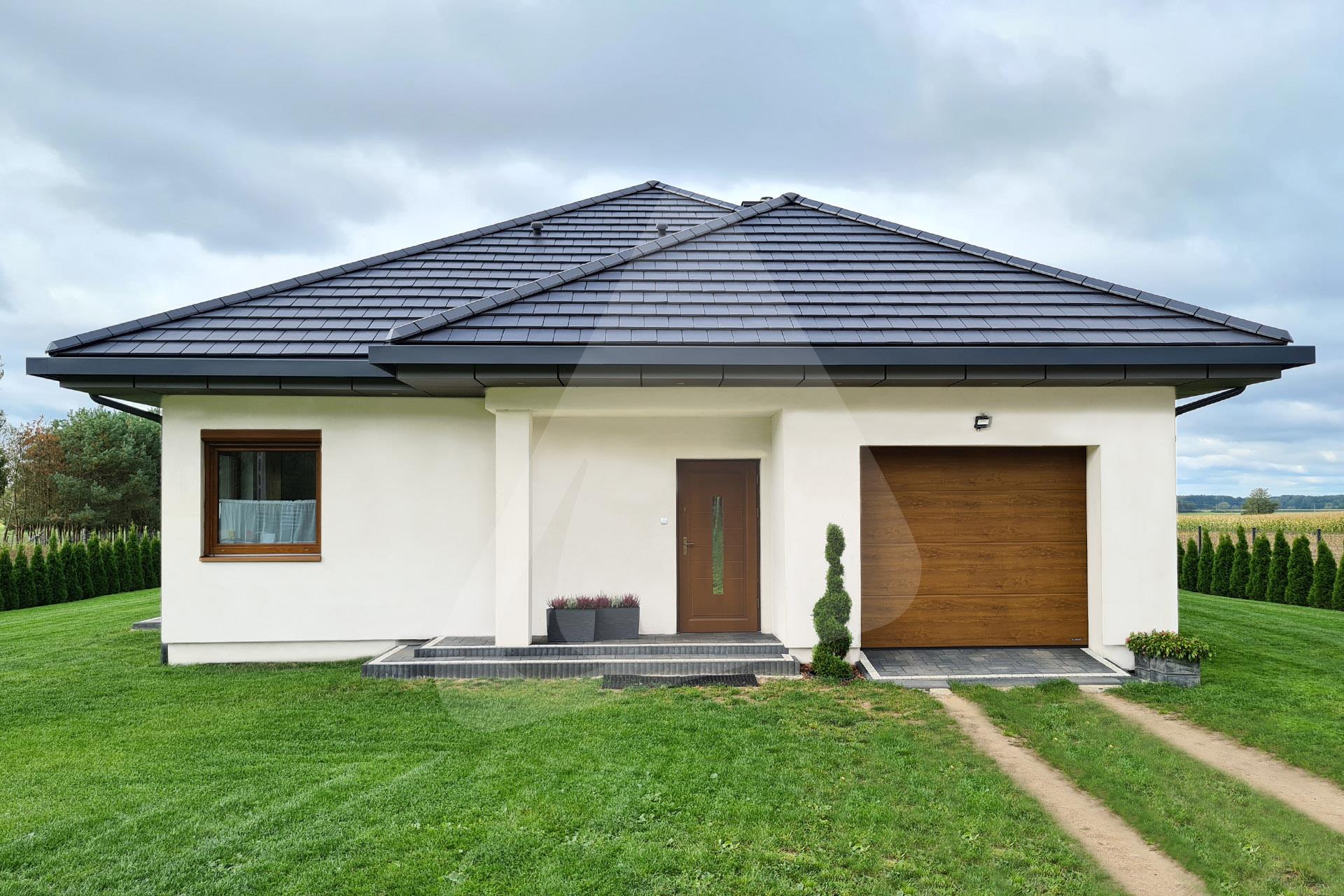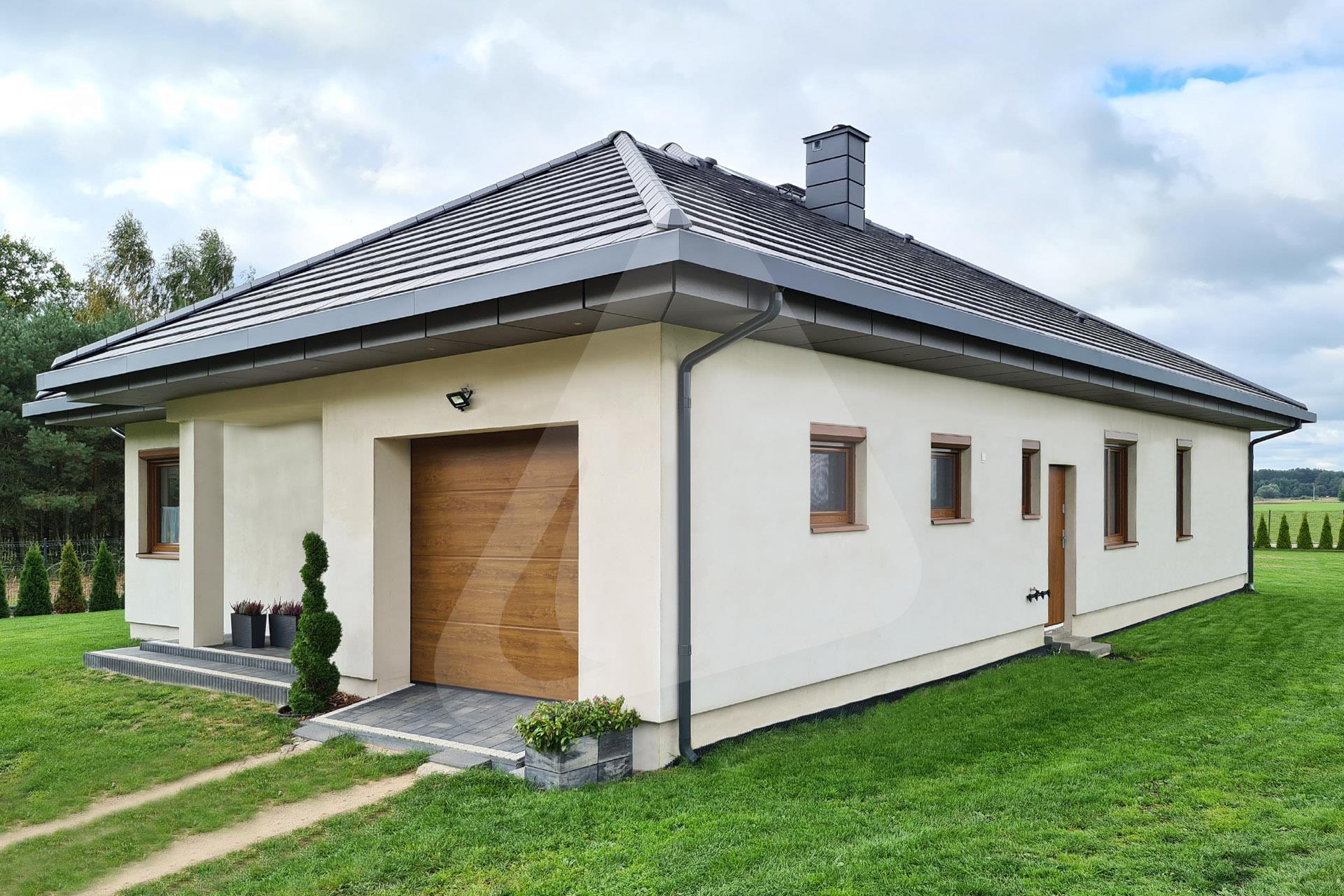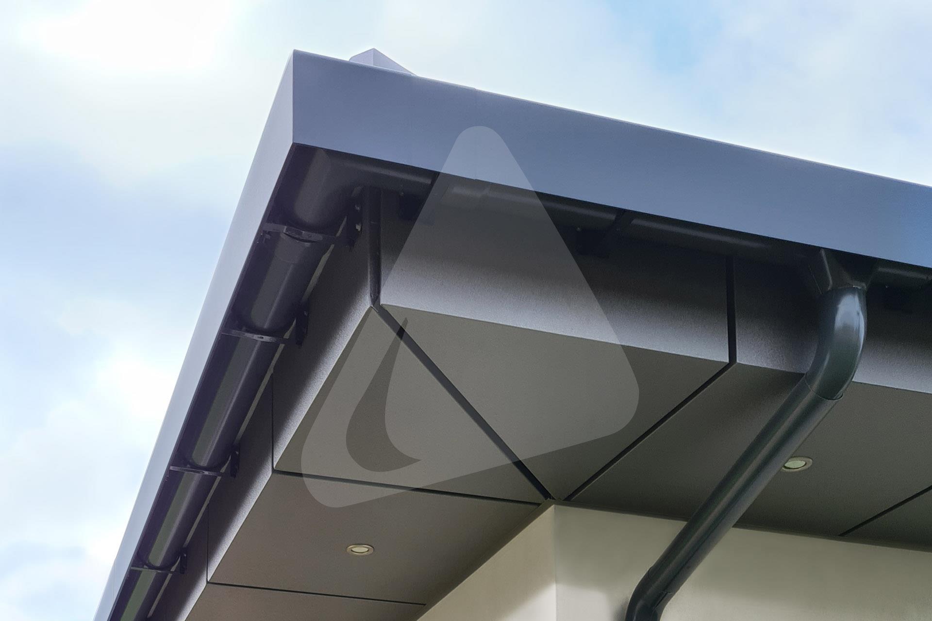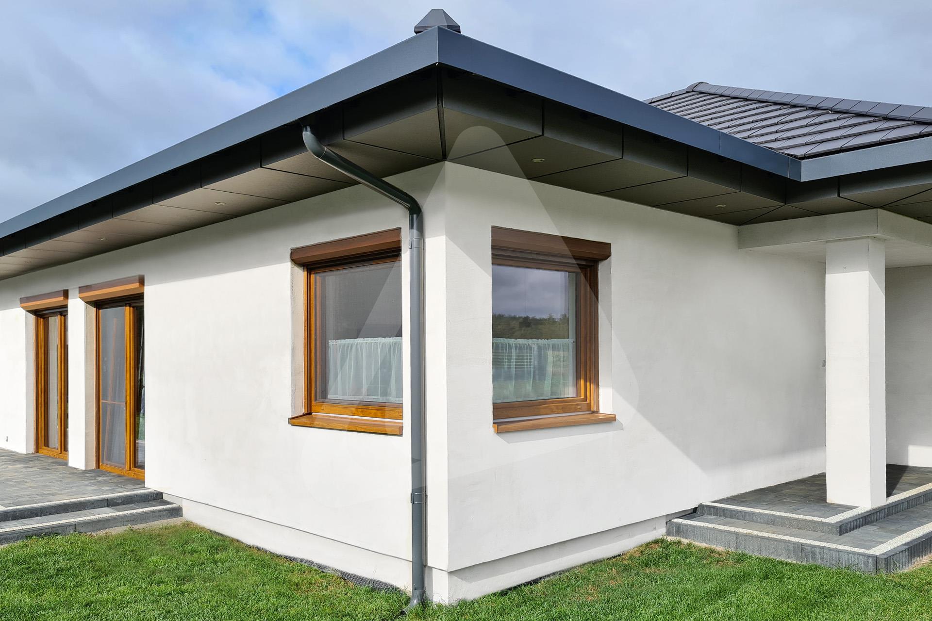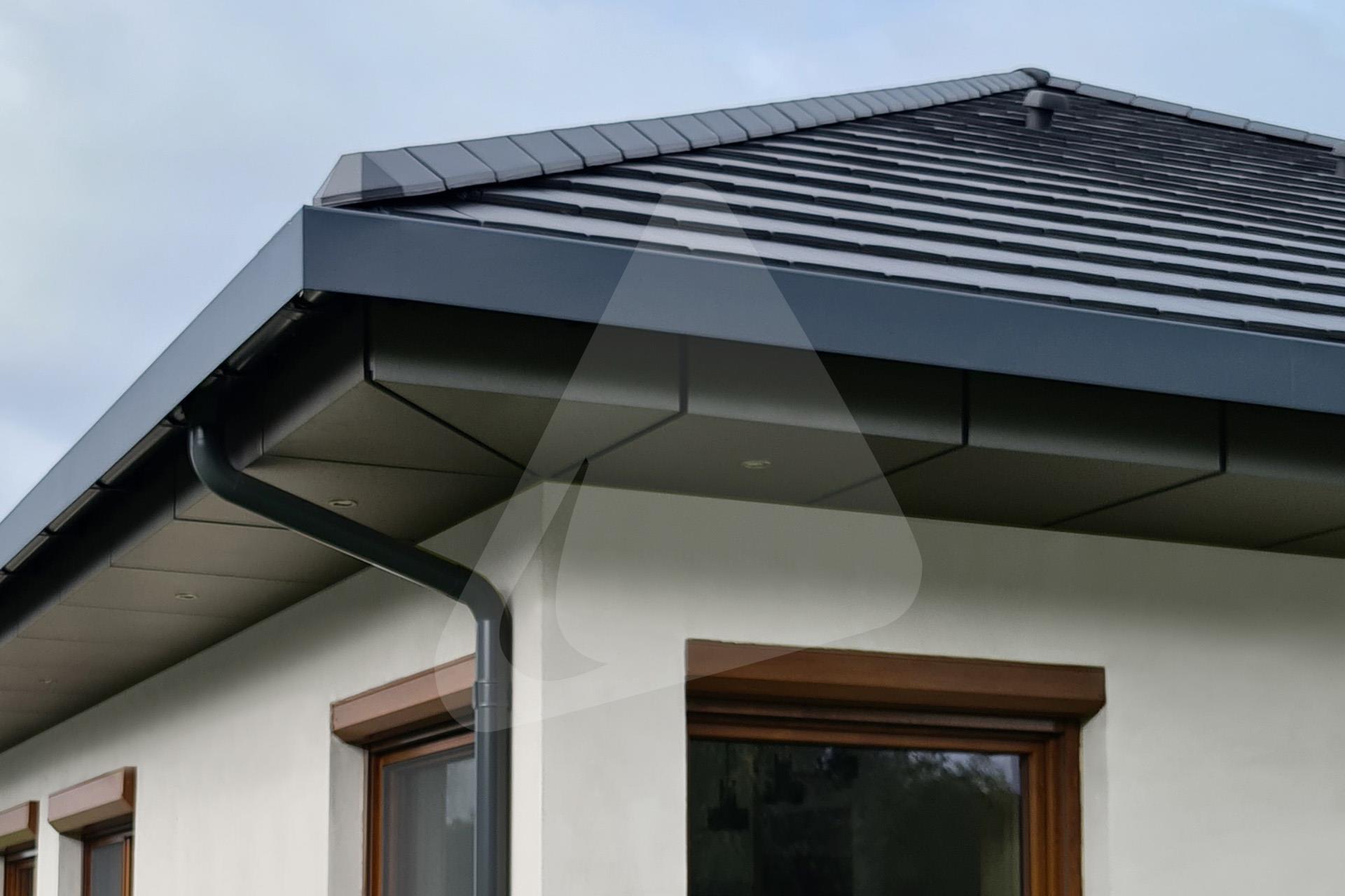 W prezentowanej realizacji zastosowano system rynny ukrytej Siba Modern w rozmiarze 150/90 mm oraz kolorze antracytowym, pokrycie dachowe stanowi płaska dachówka w kolorze antracytowym.