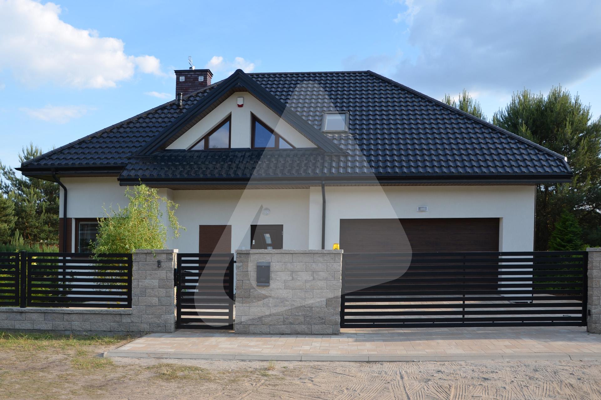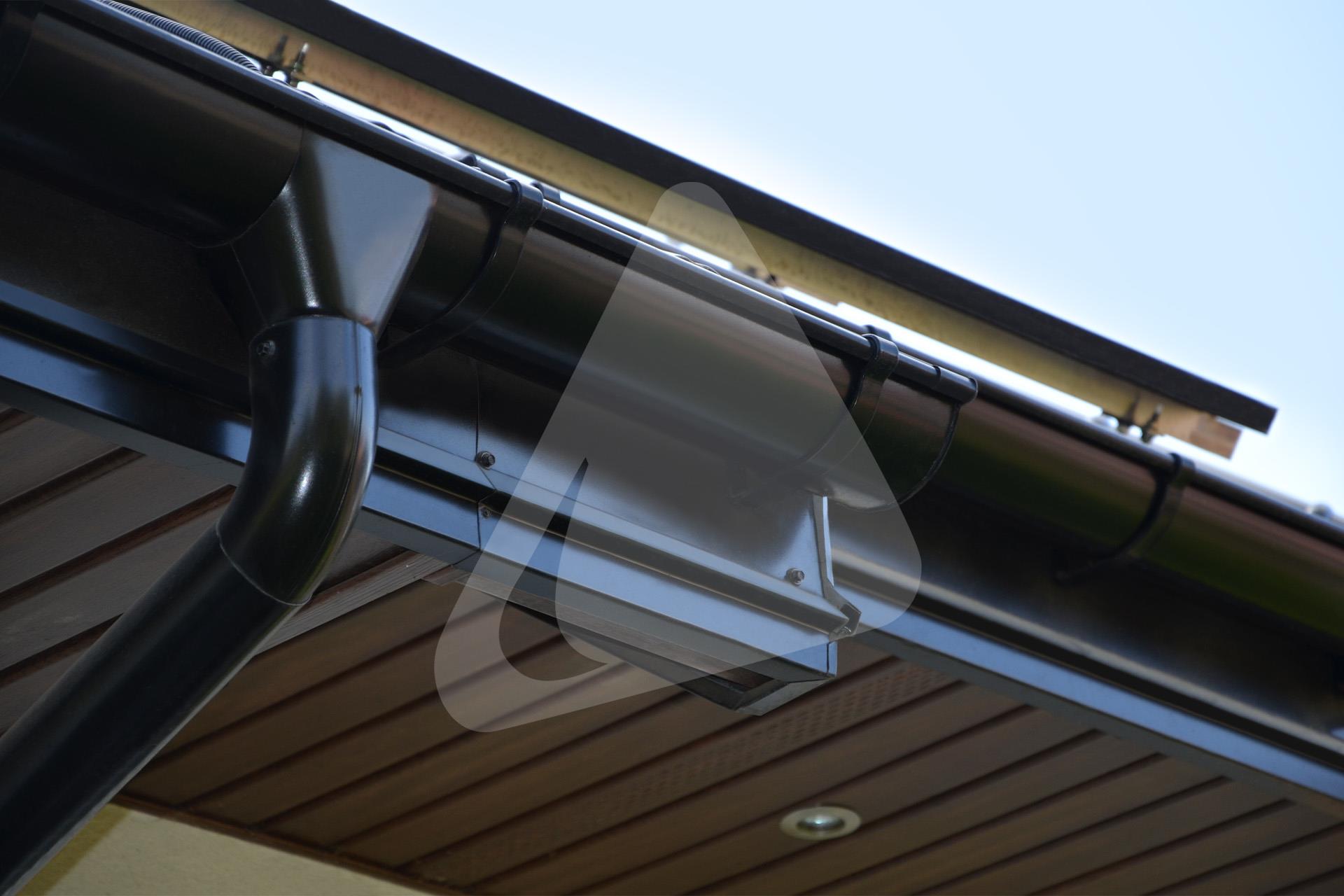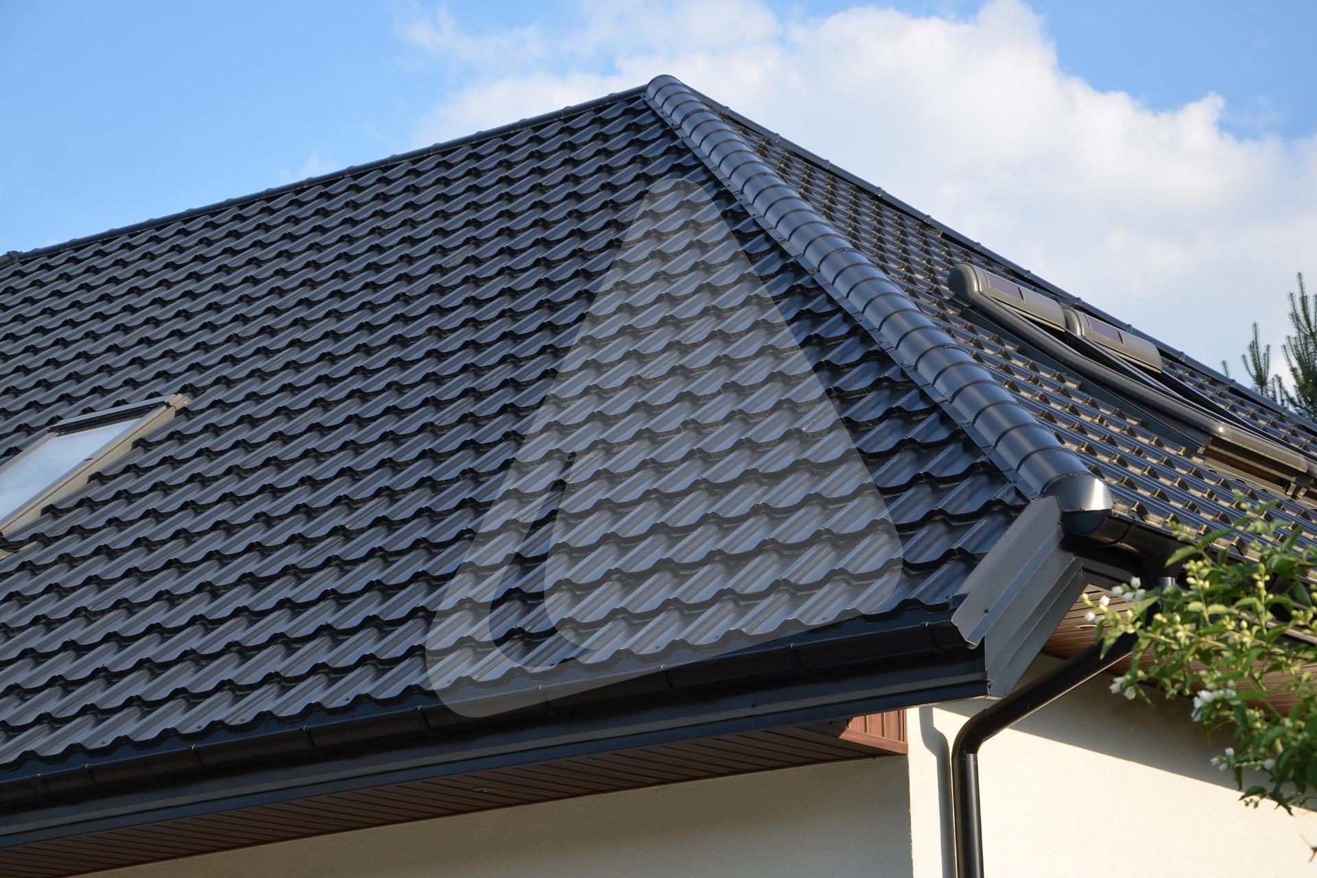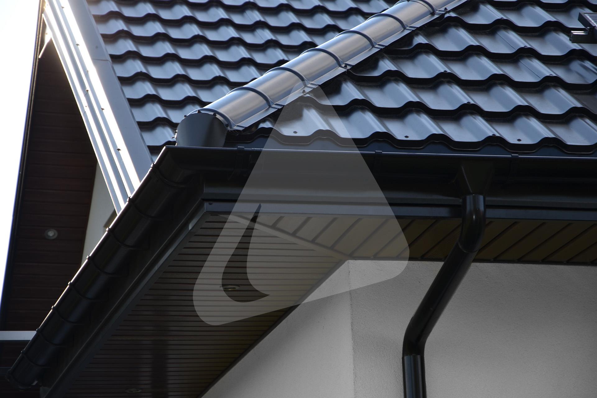 W prezentowanej realizacji zastosowano system rynny półokrągłej Siba Round w rozmiarze 150/90 mm oraz kolorze czarnym, pokrycie dachowe stanowi blachodachówka modułowa Plannja Flex w kolorze czarnym.